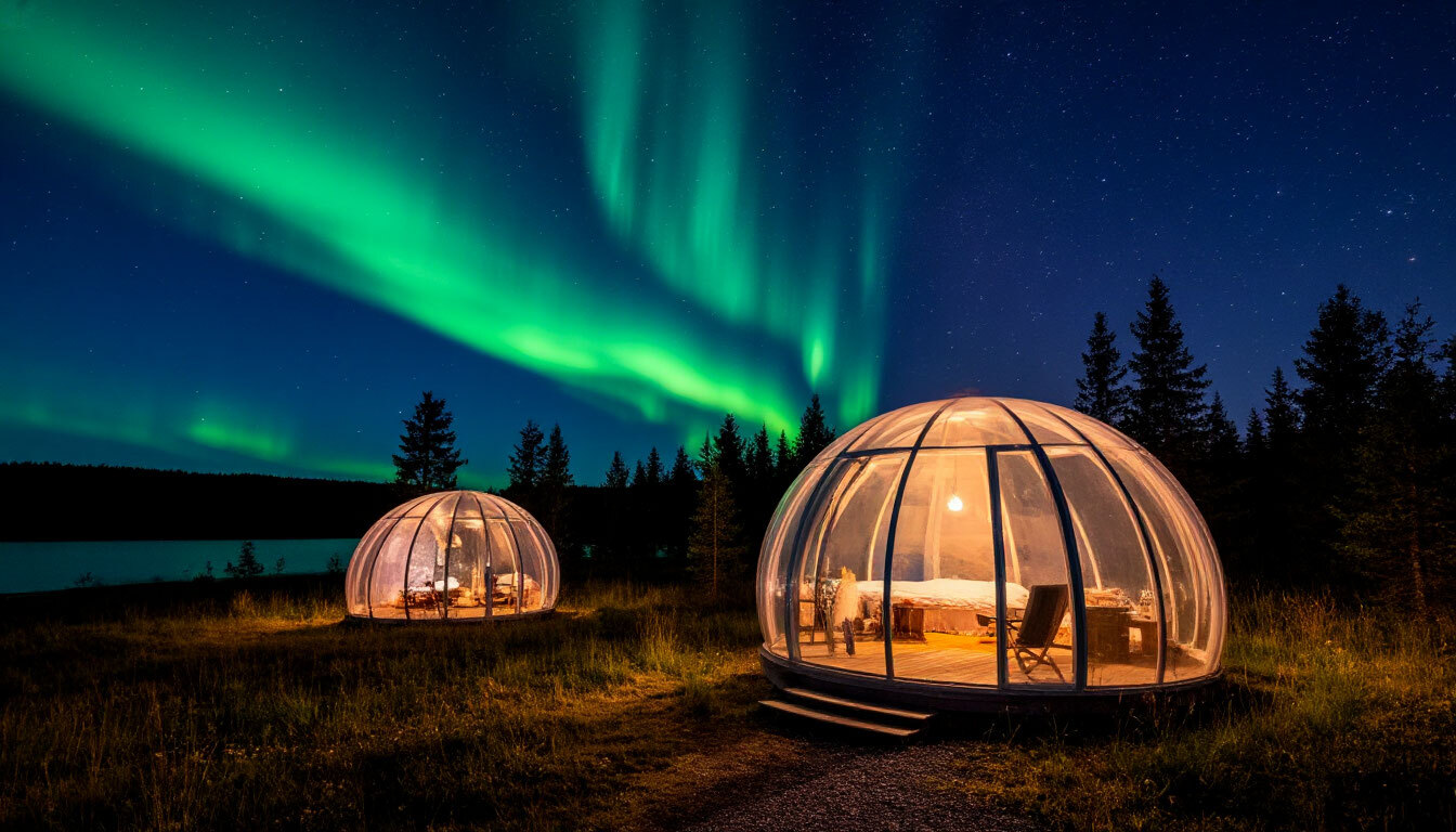 Снаружи: Это могут быть просторные шатры сафари-стиля с деревянными платформами, футуристичные геодезические купола, уютные амбарчики на сваях («дома на ножках»), ретро-вагончики, стилизованные под жилища кочевников юрты или даже сказочные домики хоббитов. Ключевая особенность — большие панорамные окна или даже прозрачная крыша для наблюдения за звездами.